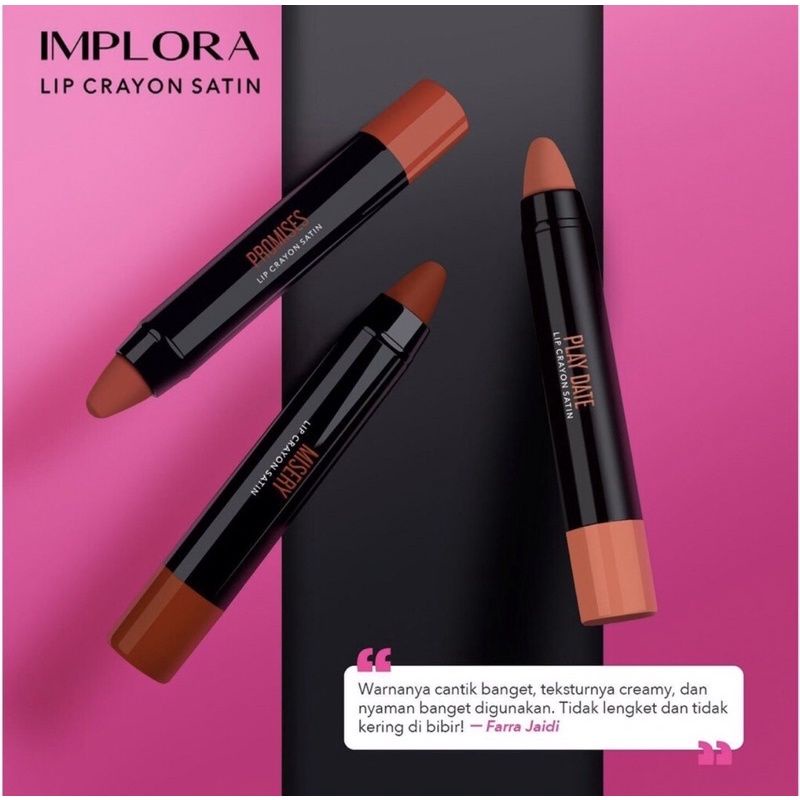 Implora Lip Crayon Satin dengan formula yang mengandung berbagai omega 3,6,9 dan Vitamin C yang berfungsi membantu menjaga kelembaban alami bibir hingga tampak memukau dan memberikan hasil akhir warna creamy / satin pada bibir serta tahan lama. Dengan ujung lip crayon yang mudah diaplikasikan ke bibir.