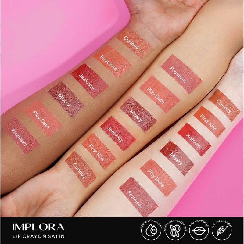 Implora Lip Crayon Satin dengan formula yang mengandung berbagai omega 3,6,9 dan Shea Butter yang berfungsi membantu menjaga kelembaban alami bibir hingga tampak memukau dan memberikan hasil akhir warna creamy / satin pada bibir serta tahan lama. Dengan ujung lip crayon yang mudah diaplikasikan ke bibir.