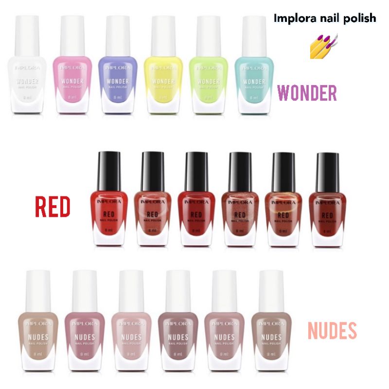 Warnai kuku Anda dengan warna-warni yang menarik dari 4 varian warna: - Implora Nail Polish Nudes - Implora Nail Polish Clear - Implora Nail Polish Wonder - Implora Nail Polish Red