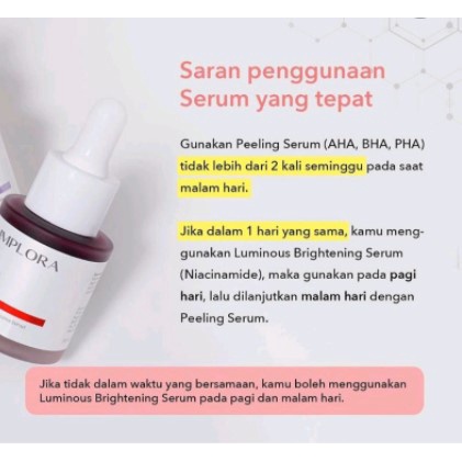 *PEELING SERUM Implora Peeling Serum membantu mengangkat sel kulit mati serta kotoran pada wajah yang menyebabkan munculnya komedo dan jerawat serta dapat menutrisi, melembabkan dan mencerahkan kulit wajah. Untuk hasil maksimal, gunakan 2 kali dalam seminggu. - Direkomendasikan untuk semua jenis kulit - Penggunaan malam hari - Mengandung : AHA, BHA, PHA, Licorice Extract, Aloe Vera Extract