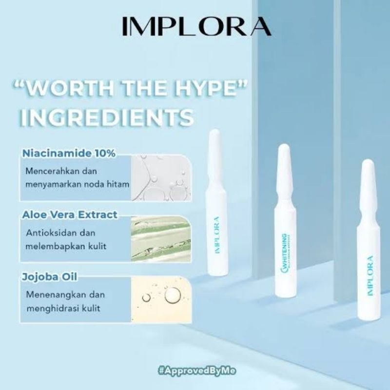 Implora Whitening Milky Serum Ampoule diperkaya dengan 10% Niacinamide bekerja 3x lebih efektif mencerahkan, menyamarkan noda hitam dam meningkatkan elastisitas kulit.
