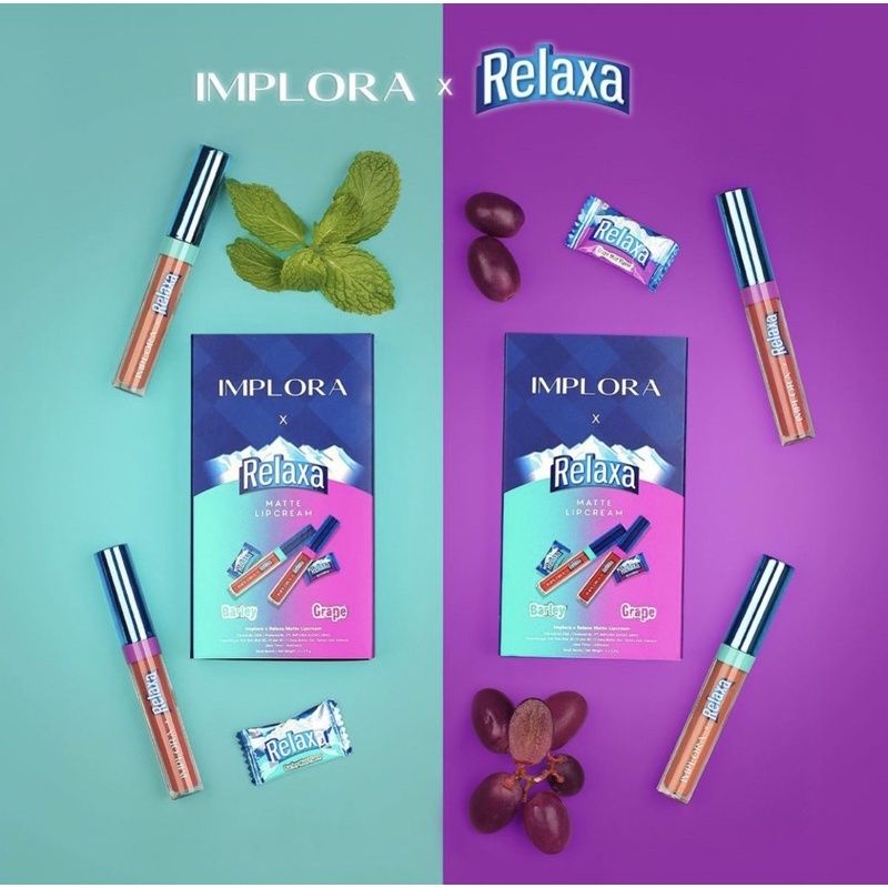 Dalam kemasan terdapat: 1 Implora x Relaxa Matte Lipcream Barley 1 Implora x Relaxa Matte Lipcream Grape