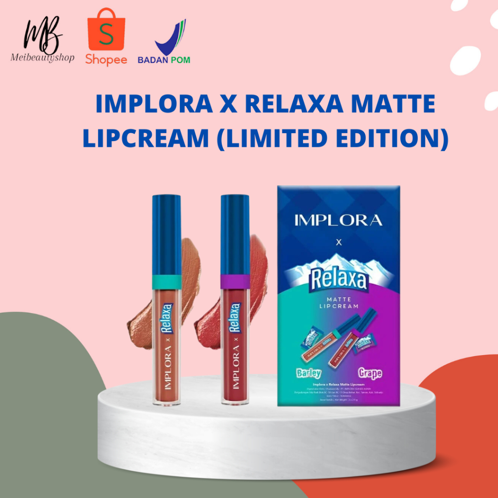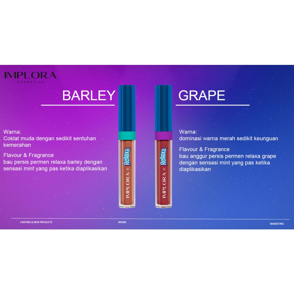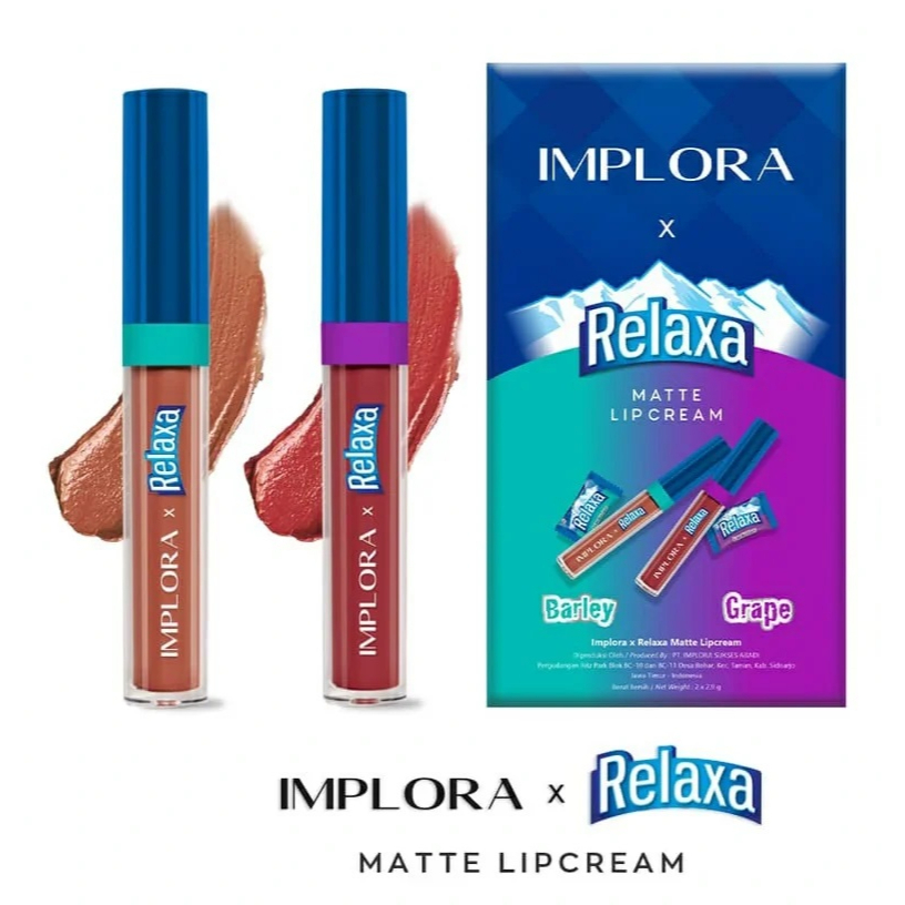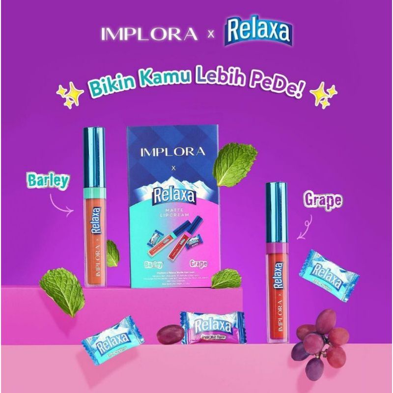 Bikin Kamu Lebih pede Matte Lipcream Implora yang berkolaborasi dengan Relaxa. Terdiri dari 2 varian yaitu rasa Barley dan Grape memberikan sensasi mint yang menyegarkan. Sapuan warna yang indah membuat bibir terlihat lebih menarik. Dalam kemasan terdapat: 1 Implora x Relaxa Matte Lipcream Barley