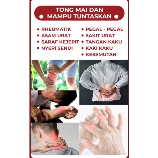 Khasiat Dan Kegunaan Tong Mai Dan: *Digunakan secara tradisional untuk melancarkan peredaran darah, sakit otot, sakit pinggang, sakit urat, Rhematik Dan asam urat * Mengobati rematik dan asam urat. * Menghilangkan pegal-pegal. * Melancarkan aliran darah di tubuh. * Menghilangkan kesemutan. * Mengatasi kaku-kaku pada kaki dan tangan. * Menghilangkan nyeri sendi. * Mengatasi keluhan sakit pinggang. * Telapak tangan dan kaki terasa baal.