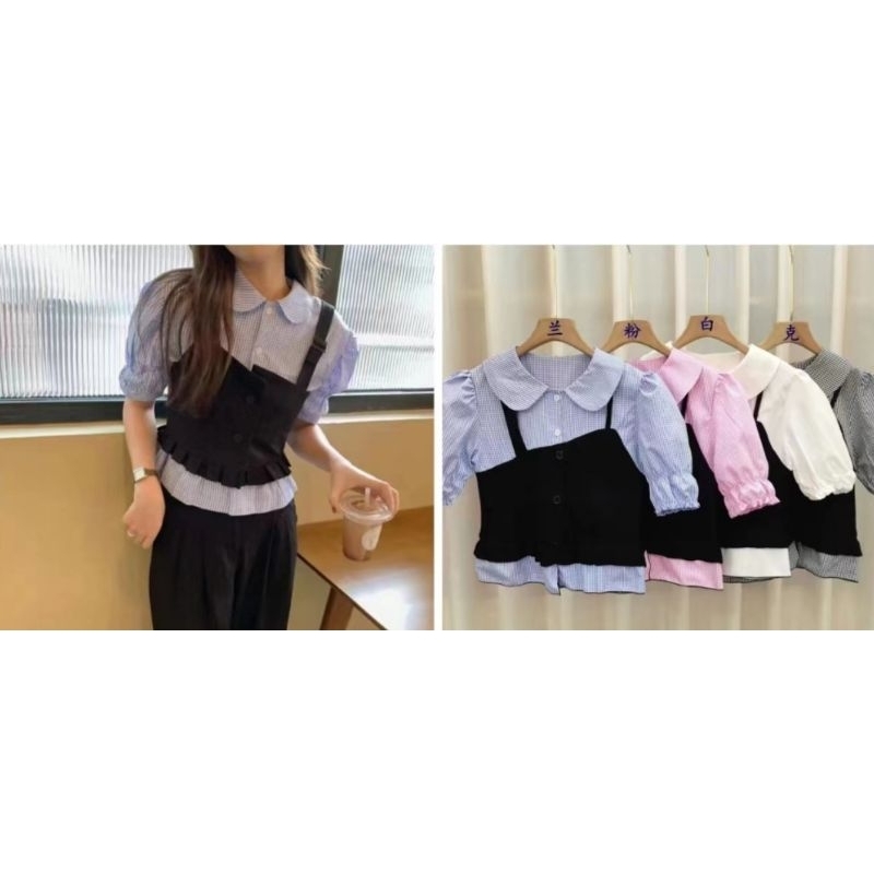 Detail ❤️ IMPORT ❤️ READY ! BECCA COLLAR TWO TONE PLAID BUTTON COMBINATION BLOUSE ( BUSUI FRIENDLY )