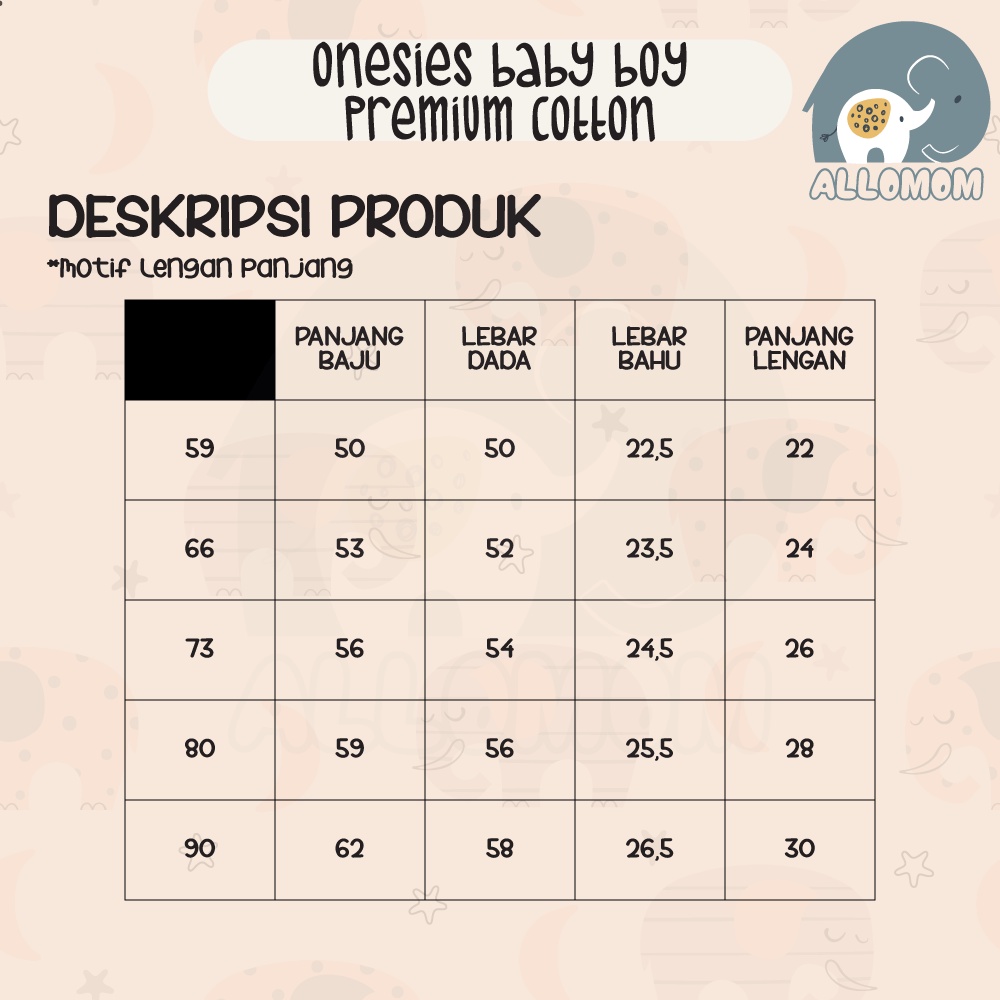 Size Chart: Size 59 [PERKIRAAN USIA 0-3 BULAN]: Panjang Baju: 48cm Panjang Lengan: 21cm Lebar Dada: 26cm Lebar Pinggang: 29cm