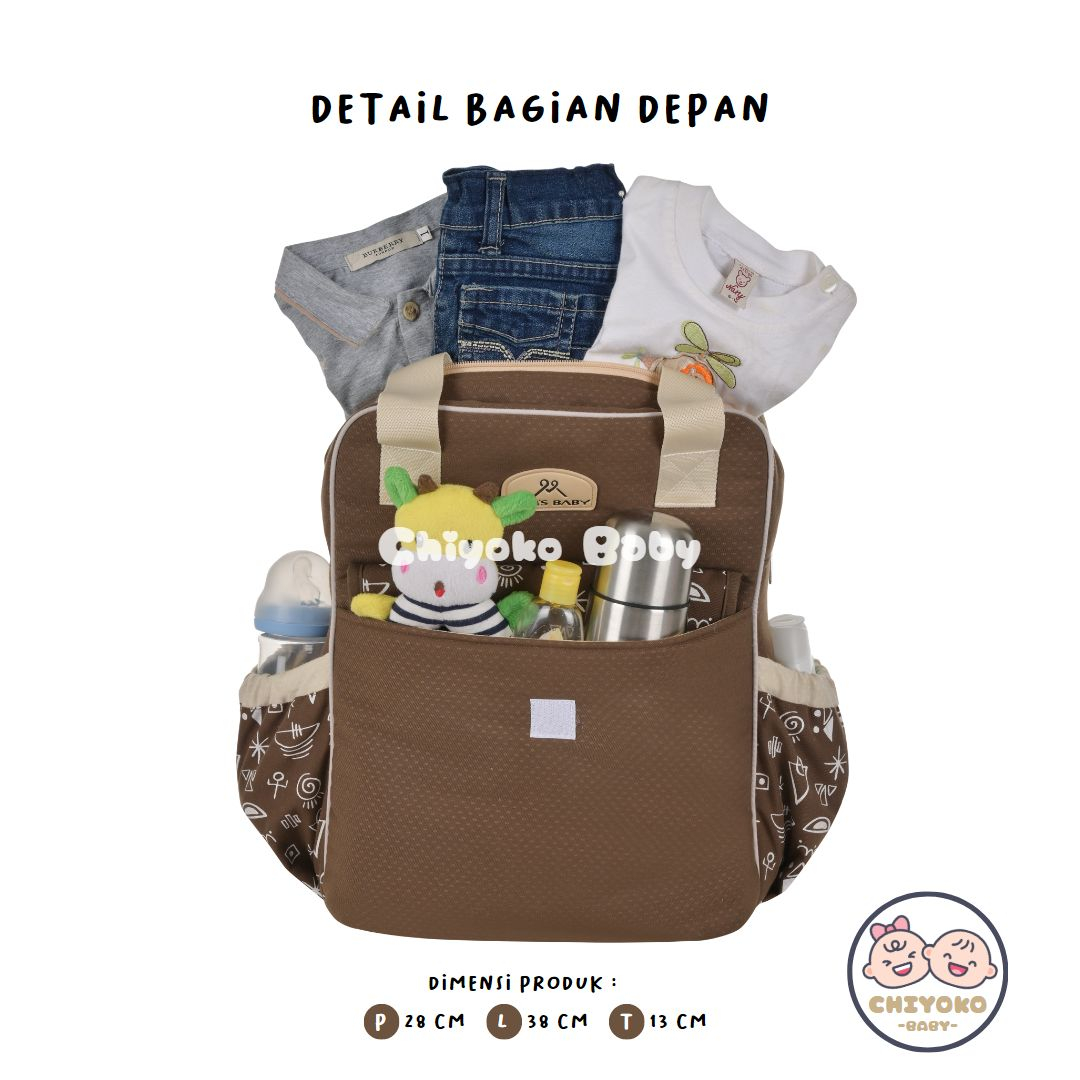 Keunggulan : • Pada bagian depan tas terdapat saku dengan aplikasi kain motif di penutup. • Pada bagian dalam tas memiliki ruang yang cukup luas untuk diisi dengan barang kebutuhan /perlengkapan bayi dengan sekat organizer. • Pada bagian samping kiri dan kanan tas terdapat saku serba guna, bisa untuk tempat tissue kecil, botol minum kecil, bisa juga untuk saku tempat makanan bayi seperti biscuit dll. • Desain menarik dan fashionable untuk dibawa berpergian.