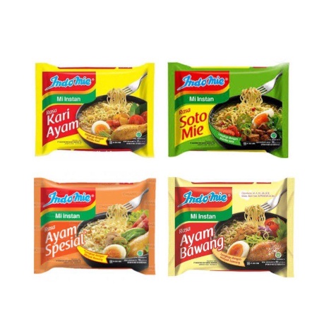 -Indomie Ayam Bawang 69gr merupakan mie instant rasa ayam bawang yang memiliki cita rasa yang gurih dan lezat. Terbuat menggunakan tepung terigu, minyak sayur, tepung tapioka, garam, pemantap, pengatur keasaman, mineral (zat besi) , pewarna (tartrazine Cl19140), antioksidan dengan tekstur yang lembut. Sehingga dapat dikonsumsi setiap saat kapanpun dan dimanapun, serta aman dikonsumsi. Mudah dibuat dengan penyajian yang tidak memakan waktu lama. -Indomie Rasa Soto yang nikmat didalam satu mangkuk mie yang menghasilkan cita rasa yang gurih dan menggugah selera untuk dinikmati semua orang. -Indomie Rasa Ayam Spesial merupakan mie instan berkuah rasa kaldu ayam spesial yang gurih. Diperkaya vitamin A, B1, B6, B12, Niasin, ASam Folat & Mineral Zat Besi. Penyajian yang mudah dan praktis. -Indomie Kari Ayam merupakan mie instan berkuah rasa kari ayam. Perpaduan antara mi, kuah dan bumbu otentik makanan khas Indonesia menjadikan Indomie kuah makanan yang sangat spesial apalagi bila disajikan dikala cuaca dingin atau hujan.