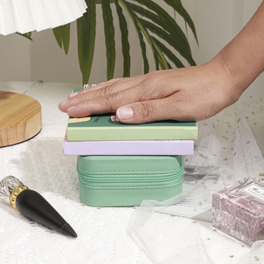 Fitur : 1. Memiliki banyak slot penyimpanan. 2. Terbuat dari bahan anti air & kuat. 3. Terdapat resleting penutup agar perhiasan tidak hilang.
