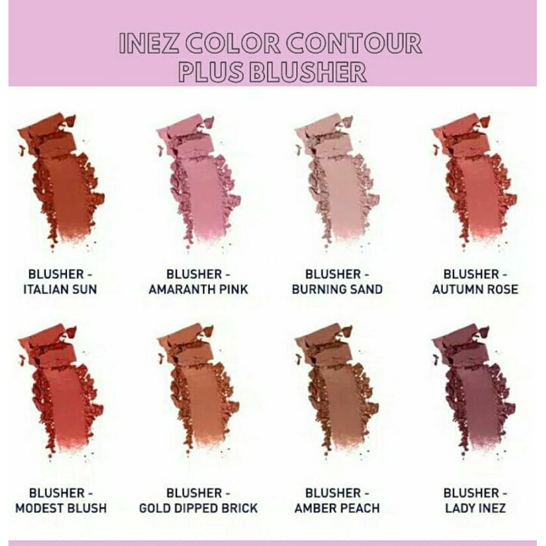 diciptakan untuk membuat wajah Merona Dan terlihat lebih sugar, mengandung anti UV Dan pelembab varian warna 01 Italian sun 02 amaranth pink 03 burning sund 04 autumn rose 05 modest blush 06 Persian rose 08 gold dipped brick 15 Amber peach 21 lady inez