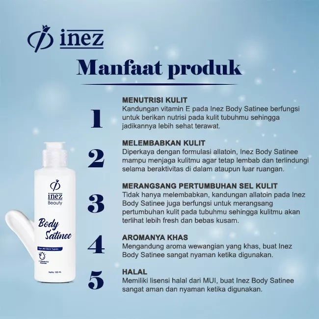 DETAIL Menutrisi Kulit Kandungan vitamin E pada Inez Body Satinee berfungsi untuk berikan nutrisi pada kulit tubuhmu sehingga jadikannya lebih sehat terawat. Melembabkan Kulit Diperkaya dengan formulasi allatoin, Inez Body Satinee mampu menjaga kulitmu agar tetap lembab dan terlindungi selama beraktivitas di dalam ataupun luar ruangan. Merangsang Pertumbuhan Sel Kulit Tidak hanya melembabkan, kandungan allatoin pada Inez Body Satinee juga berfungsi untuk merangsang pertumbuhan kulit pada tubuhmu sehingga kulitmu akan terlihat lebih fresh dan bebas kusam. Aromanya Khas Mengandung aroma wewangian yang khas, buat Inez Body Satinee sangat nyaman ketika digunakan. Halal Memiliki lisensi halal dari MUI, buat Inez Body Satinee sangat aman dan nyaman ketika digunakan.