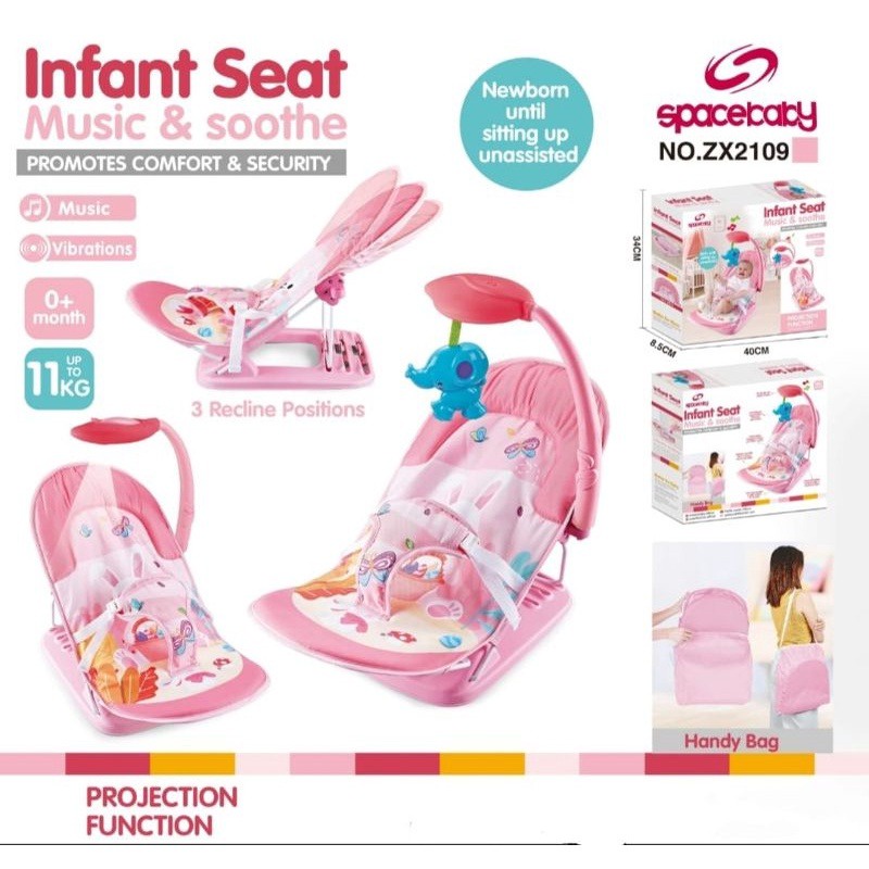 Komlpain WAJIB ada VIDIO UNBOXING ~ Bouncer Spacebaby ZX 2109 Swinger Rocker Proyektor Spesifikasi : Musik Proyektor Tiga Posisi Sandaran Vibration ( mode getar ) Up to 11 Kg Bisa untuk dari umur 0+ Tas untuk produk Bisa Lipat
