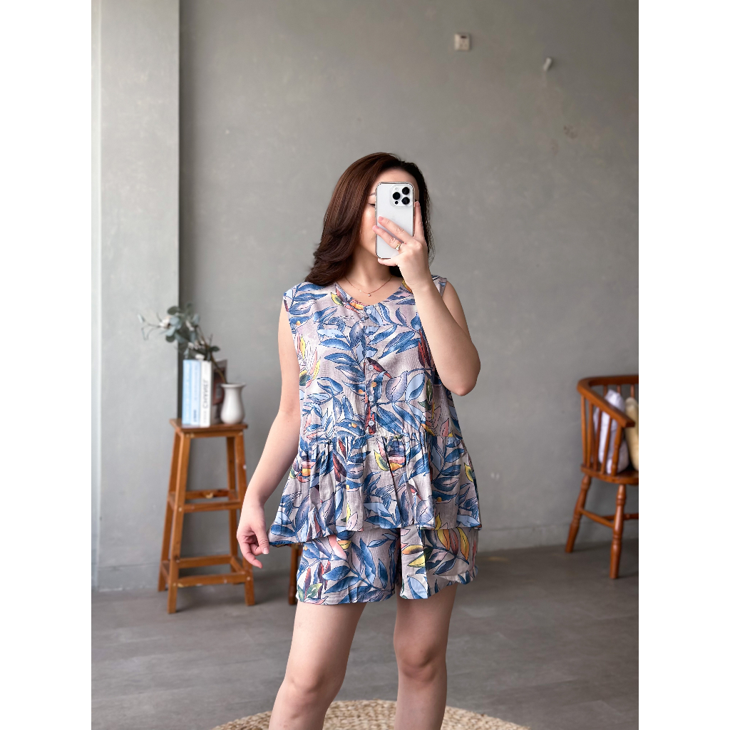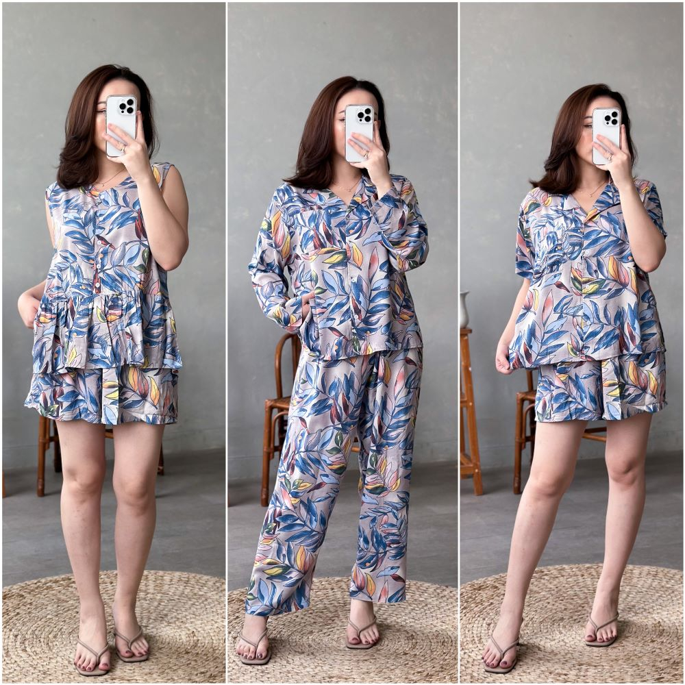 Detail INFINITEE Setelan Rayon Lengan Pendek Celana Pendek Panjang Motif Terkini