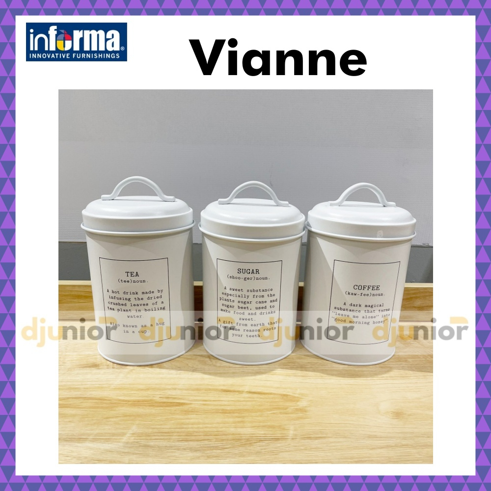 CANISTER VIANNE Isi : 3 pcs Kapasitas : 1300 ml Material : iron Dimensi produk : 36 x 9 x 15 cm Isi set: 3 pcs Jenis tutup: tarik Kapasitas: 1.3 L Lebar: 9 cm Material: besi Panjang: 36 cm Tinggi: 15 cm