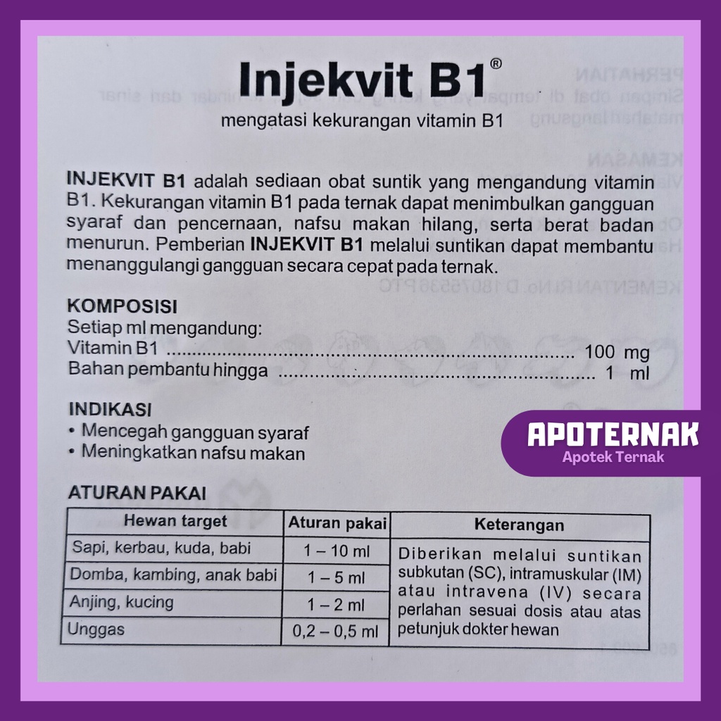 adalah sediaan obat sunttik yang mengandung vitamin B1. Kekurangan vitamin B1 pada ternak dapat menimbulkan gangguan syaraf dan pencernaan, nafsu makan hilang, serta berat badan menurun. Pemberian INJEKVIT B1 melalui sunttikan dapat membantu menanggulangi gangguan secara cepat pada ternak.