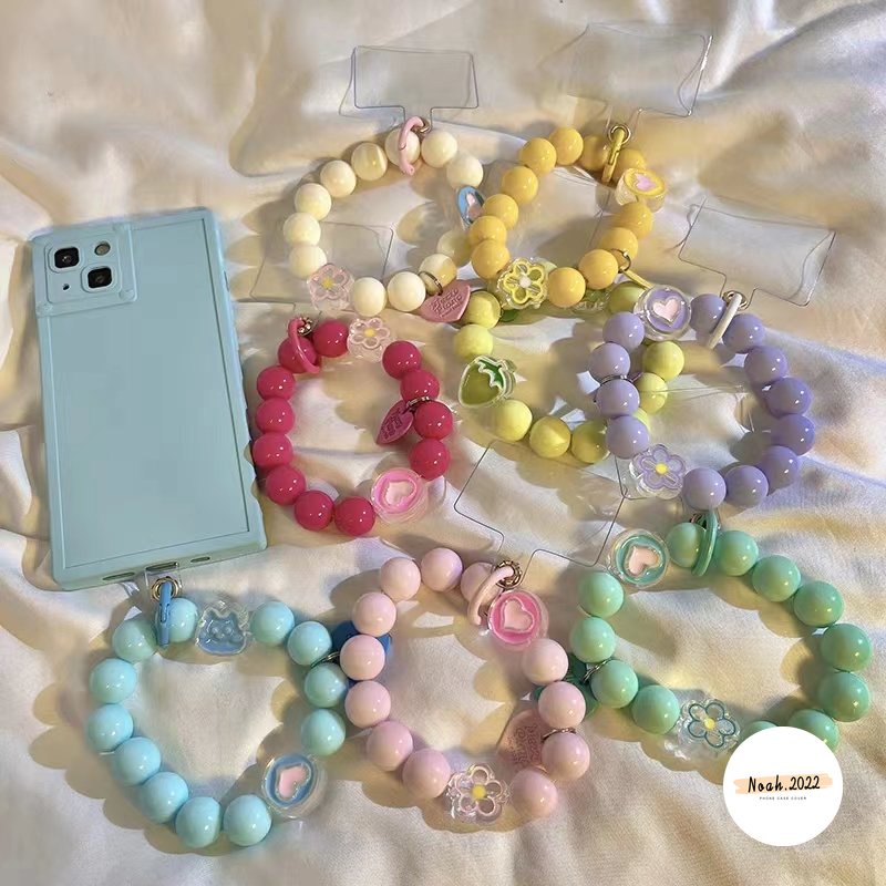 Ins Permen Warna Macaron Manik Gantung Rantai Telepon Pendek Ponsel Lanyard Lucu 3D Beruang Cinta Hati Bunga Pergelangan Tangan Tali Gelang Anti-lost Case Lanyard Gantungan Kunci Gadis Tas Aksesori