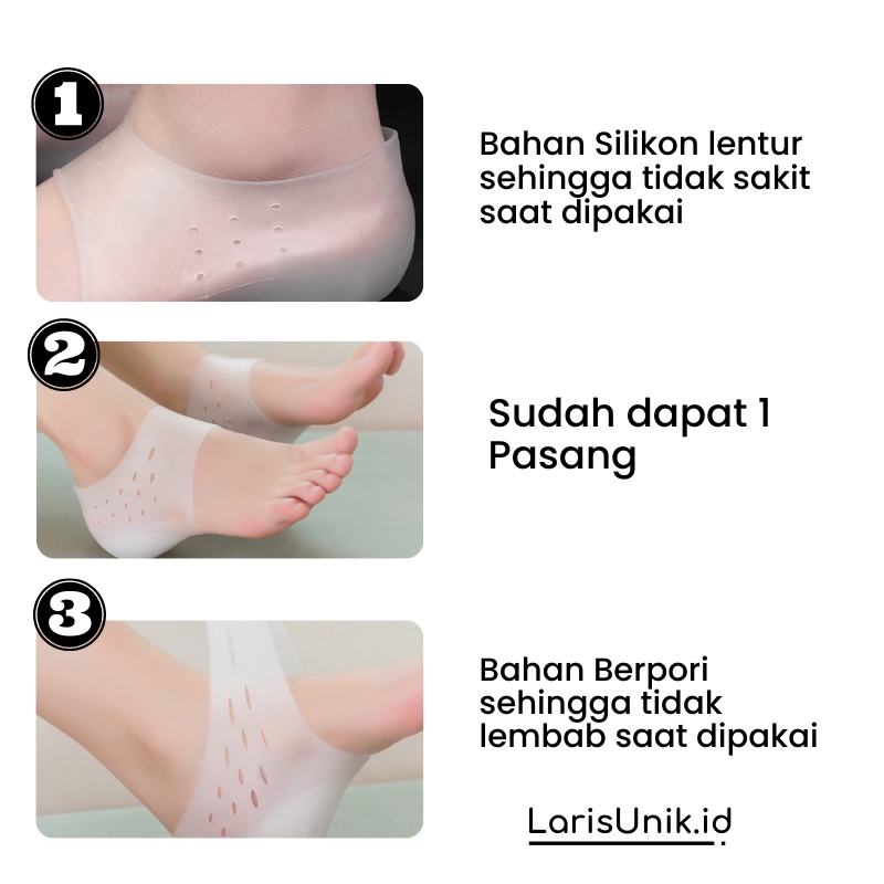 KENAPA HARUS PRODUK INI? ✅ Dapat Anda gunakan di balik kaos kaki dan sepatu Anda. ✅ Dibuat dari bahan silikon berkualitas tinggi yang lembut sehingga memberikan rasa nyaman kepada pengguna. ✅ Mengurangi rasa nyeri pada area tumit kaki sehingga aman ketika digunakan dalam waktu yang lama. ✅ Membantu meningkatkan tinggi badan Anda bahkan hingga 3-5cm.