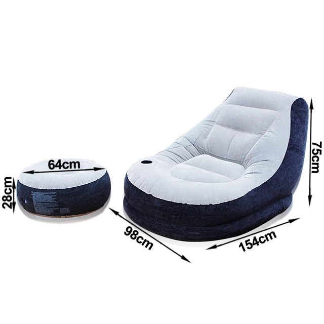 Intex Inflatable Ultra Lounge with Ottoman 68564 Product Description Elegant and useful Intex Inflatable Ultra Lounge with Ottoman 68564 will surely enhance the look of your home. This clever, comfortable inflatable chair-and-ottoman set, from inflatable goods maker Intex, features soft flocked material, an angled backrest, and built-in cup holder. The portable and surprisingly versatile furniture can be used camping, tailgating, relaxing around the house, and more, and it inflates in just minutes.