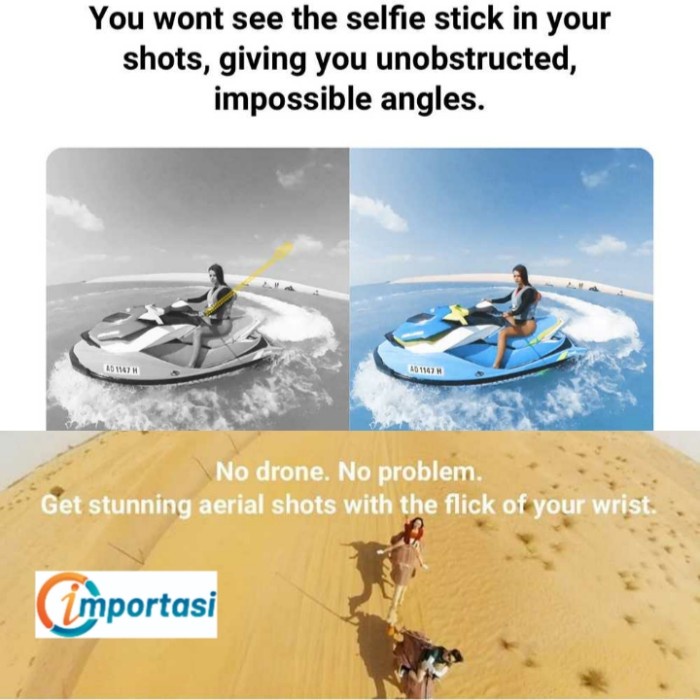 Dengan tongsis selfie stick ini, tak ada lagi stick yang menghalangi hasil tangkapan gambar atau video Anda. Pada tampilan gambar atau video, stick seakan tembus pandang yang membuatnya tampak seperti menggunakan drone.
