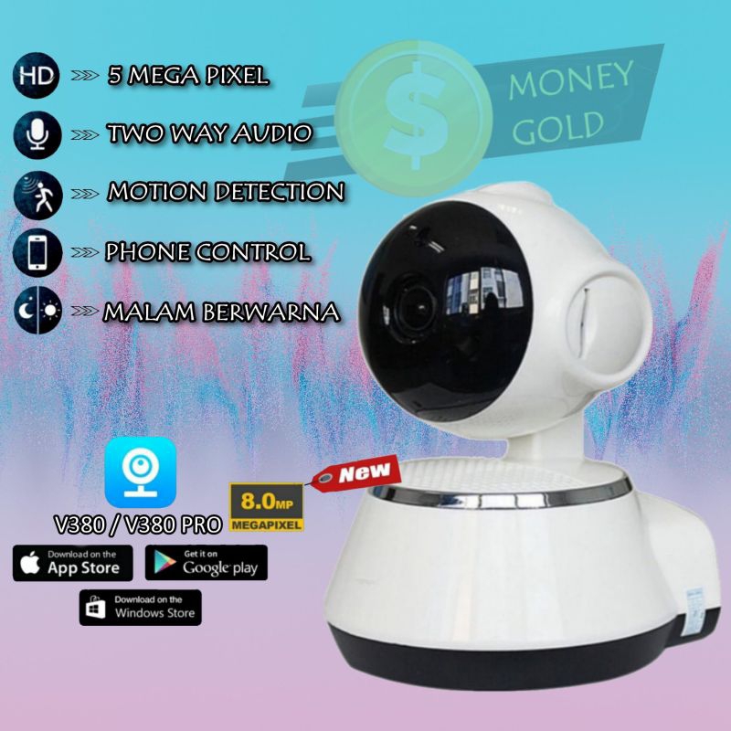 IP Camera Wireless Wifi Aplikasi V380 Resolusi 5.0MegaPixel Infrared Up to 10M Pan / Tlit Angle : Horizontal 355' & Vertical : 120' Power supply DC 5V Mudah untuk instalasi