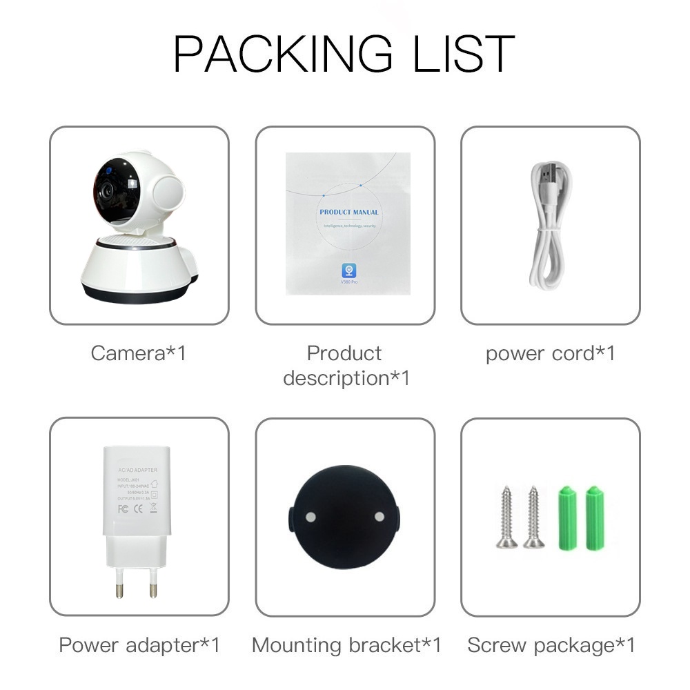 Isi Paket: 1 x 960P Mini IP Camera 1 x bracket kamera 1 x Sekrup 1x Adaptor 1x Kabel Usb Micro 1x buku panduan manual