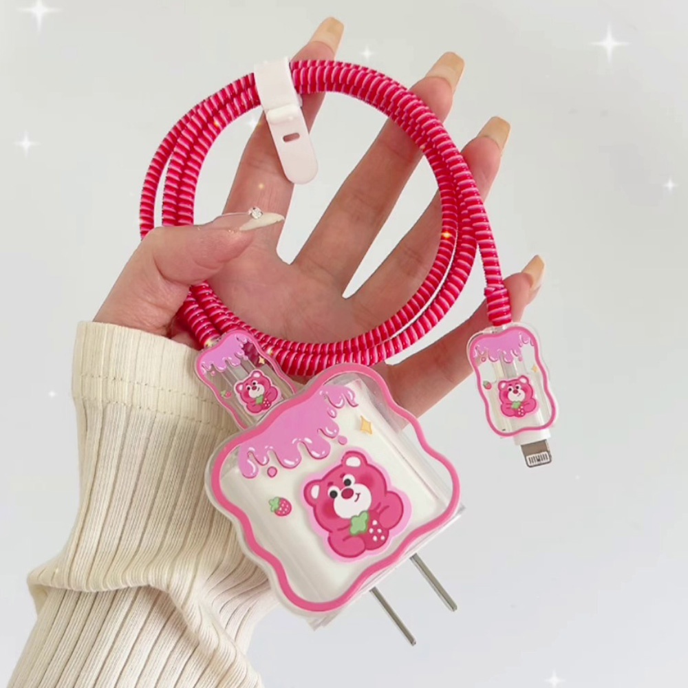 Detail IPHONE 18/20w Kartun Strawberry Teddy Bear Casing Pelindung Untuk Iphone11 /12 /14 /13 Charger Case Pelindung Kabel Data