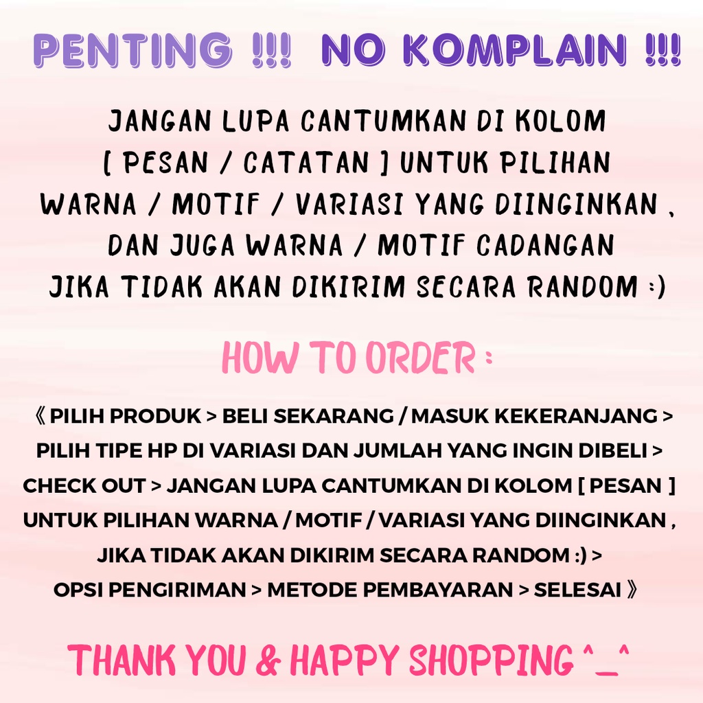 CARA ORDER : 《 PILIH PRODUK > BELI SEKARANG / MASUK KEKERANJANG > PILIH TIPE HP YANG INGIN DI BELI > PILIH JUMLAH YANG INGIN DIBELI > CHECK OUT > JANGAN LUPA CANTUMKAN DI KOLOM [ PESAN / CATATAN ] UNTUK PILIHAN WARNA / MOTIF / VARIASI YANG DIINGINKAN , JIKA TIDAK AKAN DIKIRIM SECARA RANDOM :) > OPSI PENGIRIMAN > METODE PEMBAYARAN > SELESAI 》 TINGGAL TUNGGU PAKET DATANG DENGAN PERKIRAAN 1-5 HARI KERJA YA , TERGANTUNG LOKASI MASING"" ^_^