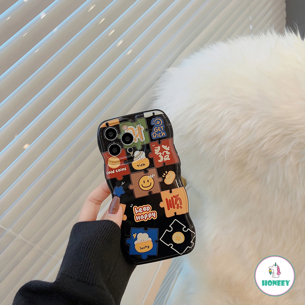 IPHONE Casing Puzzle Smiley Face Hitam Gelombang Retro Kompatibel Untuk Iphone11 12 13 14 Pro Max14 Plus Cover Shockproof Bantalan Udara
