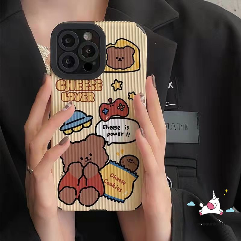 IPHONE Kartun Beruang Soft Phone Case Kompatibel Untuk Iphone11 13 14 7Plus XR 12 Pro MAX X 7 8 Plus XS MAX Fashion Rajut Pola Garis Briket Lucu Mewah Tekstur Kulit Cover