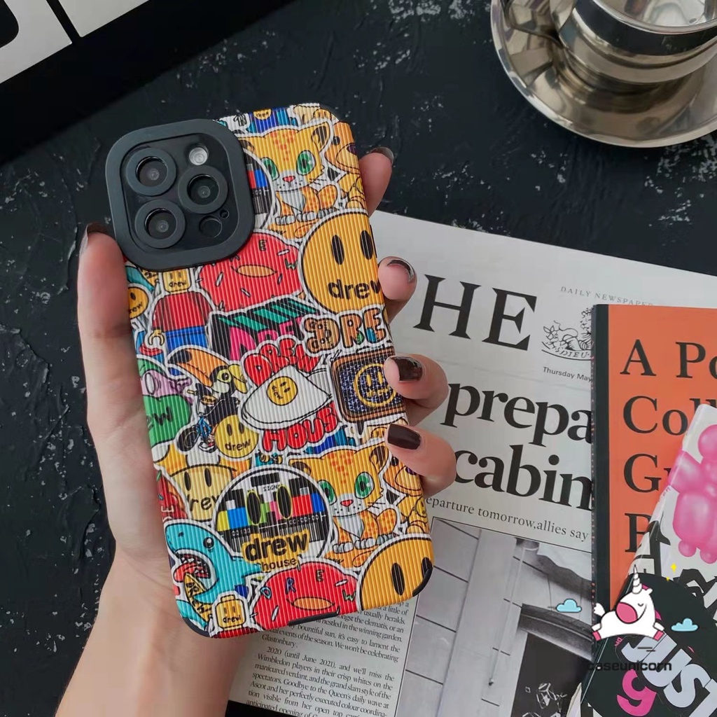 Handphone & Aksesoris > Casing & Skin > Casing & Skin Handphone > IPHONE Mewah Tekstur Kulit Lucu Graffiti Kartun Beruang Smiley Phone Case Kompatibel Untuk Iphone11 Pro Max XR 13 14 12 Pro Max7 8 Plus X XS Max Trendi Drew House Brand Soft Cover