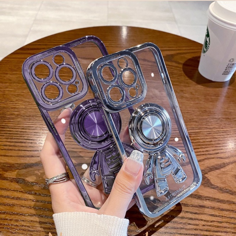 IPHONE Plating Astronot Bracket Stand Ring Holder Phone Case Untuk Iphone14 13 11 12 Pro Max XS X XR 7 8 Plus Cover Transparan
