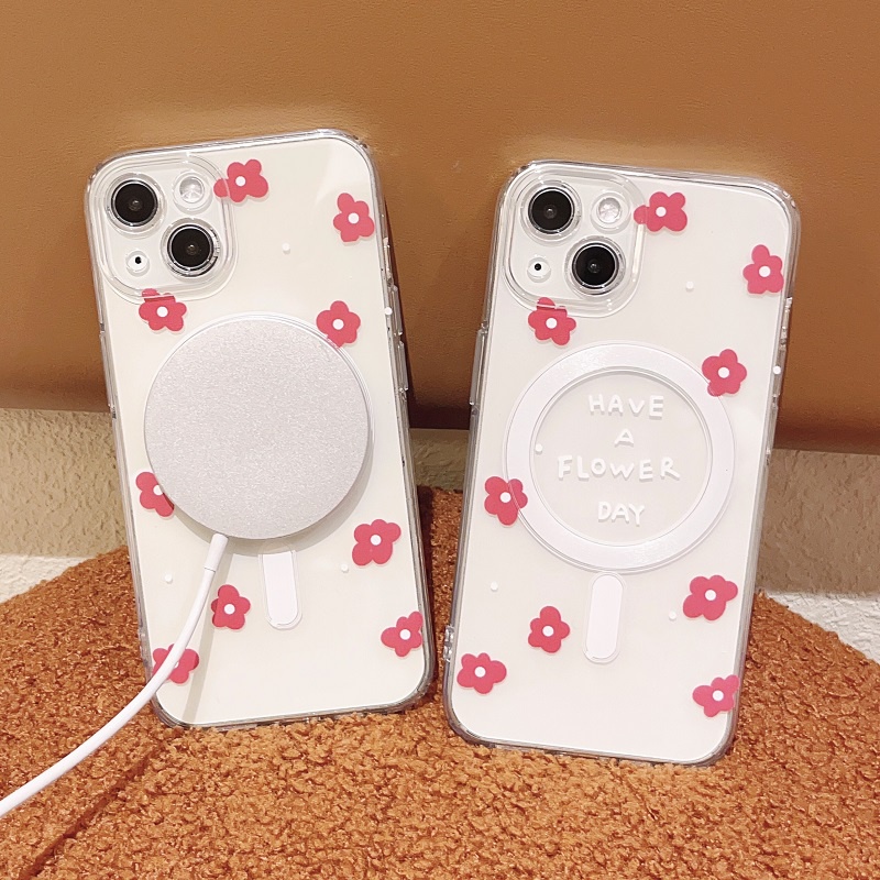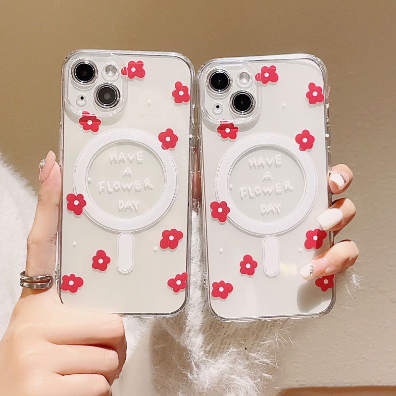 Handphone & Aksesoris > Casing & Skin > Casing & Skin Handphone > IPHONE Untuk Iphone14 13 12 11 Pro Max Casing charge Magnetik Transparan Merah Bunga Kecil Telepon Soft case