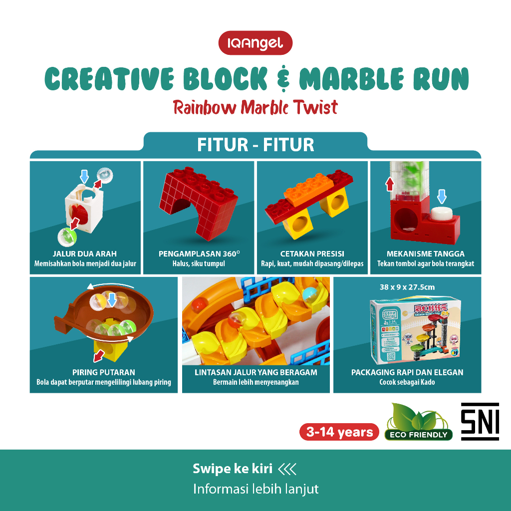 Keunggulan : - Jalur dua arah : Dapat memisahkan bola kedalam dua jalur - Pengamplasan 360° : Material halus dan sikunya tumpul sehingga aman untuk anak - Cetakan Presisi : Rapi, kuat juga mudah dipasang/dilepas - Mekanisme tangga : Terdapat tombol yang dapat ditekan agar bola terangkat - Piring Putaran : Bola dapat berputar mengililingi lubang piring - Lintasan Jalur Yang Beragam : Bermain lebih menyenangkan dan tidak membosankan - Packaging Rapi dan Elegan : Cocok untuk kado kekerabat - Material terbuat dari ABS Eco Friendly - Sudah bersertifikat SNI - Terdapat buku petunjuk untuk merakit
