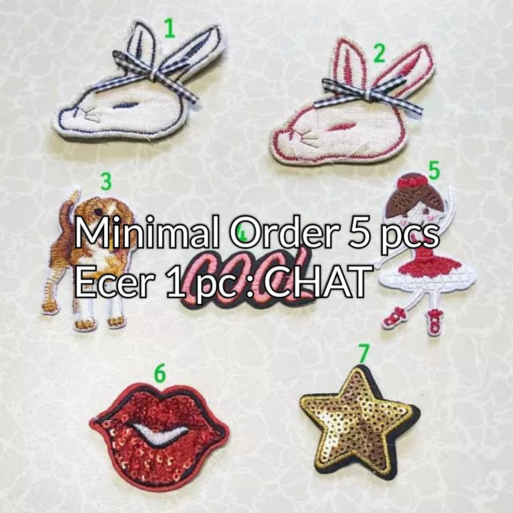Iron Patch Fancy / Emblem Bordir Cute (vi) . uk 6,5x 5,5cm - 5x5 cm No. 1,2,3,5,6,7 Rp 7.000/ Pcs No .4 Rp 5.600/ Pcs . Iron Patch merupakan aplikasi pakaian yang berbahan bordir (digital). Cara penggunaan dari Iron patch tidak perlu dijahit, cukup tempelkan aplikasi iron patch pada pakaian, jaket, celana, dsb lalu gunakan setrika yang sudah panas (disarankan melapisi iron patch dengan handuk tipis) tekan iron patch kurang lebih selama 20-30 detik dan jangan di gosok. Pastikan bagian lem sudah merekat sempurna. Nb: iron patch tidak cocok digunakan di media berbahan kulit, plastik, dan parasut . .
