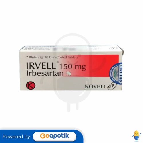 Deskripsi : PENGGUNAAN OBAT INI HARUS SESUAI PETUNJUK DOKTER. Digunakan untuk mengobati tekanan darah yang tinggi. Irbesartan dapat juga digunakan untuk mengatasi gangguan ginjal yang disebabkan oleh diabetes tipe 2. | Komposisi : Tiap tablet mengandung irbesartan 150 mg | Dosis : ATURAN PAKAI HARUS SESUAI DENGAN PETUNJUK DOKTER. Hipertensi: 150 mg sekali sehari, dapat ditingkatkan menjadi 300 mg sekali sehari jika dibutuhkan. Pada pasien yang menderita penurunan cairan intravaskular: Dosis awal: 75 mg sekali sehari. Diabetik nefropati pada diabetes melitus tipe 2: 150 mg sekali sehari, dapat ditingkatkan menjadi 300 mg sekali sehari jika dibutuhkan. | Indikasi : Digunakan untuk mengobati tekanan darah yang tinggi. Irbesartan dapat juga digunakan untuk mengatasi gangguan ginjal yang disebabkan oleh diabetes tipe 2. | Perhatian Khusus : Obat antihipertensi umumnya digunakan seumur hidup, jangan gunakan irbesartan saat sedang hamil atau sedang menyusui. | Kemasan : Dus 2 X 10 tablet salut selaput | NIE : DKL0133502517A1