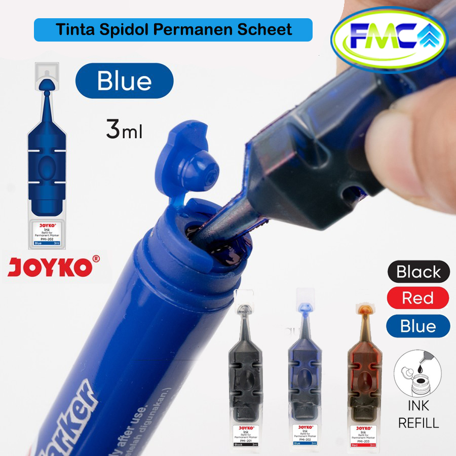 Spesifikasi Produk: - Merk: JOYKO - Kode: PMI - Warna: Hitam, Merah, Dan Biru - Tipe: Permanen (Tidak Dapat Dihapus) - Bahan: Plastik - Isi: 3ml / Pcs - Keterangan: Tinta untuk refill spidol permanen segala merek, cukup potong kemasan dan tinta bisa langsung dituang, sangat praktis dan menghindarkan dari resiko tumpah atau tercecer