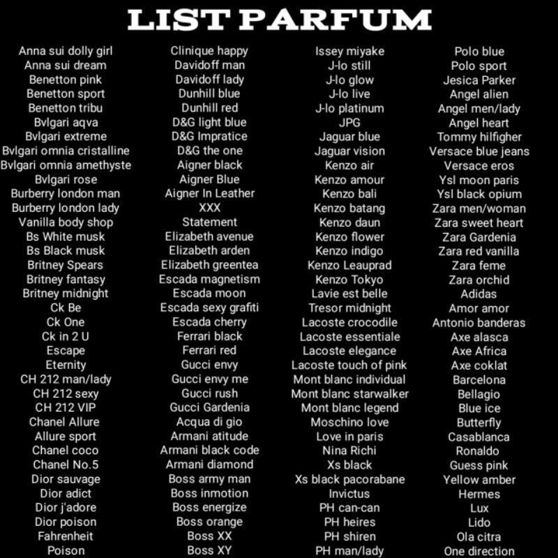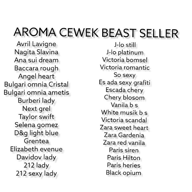 forever night Gucci Gardenia Gucci envime coconut peri Elis Paris siren Paris Hilton Paris heries lifboy Lux Lacoste gues pink Avril Lavigne Vanila 212 lady Anasui dream Anasui Dolly Paris SIREN Nagita Sarah Jesika Parker Jlo still Bacarat Escada sexy grafity Escada Cherry Victoria so sexy Victoria romentic Tailor Swift Harajuku love Cudlle Olla citra