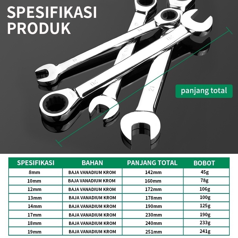 Merk: ISKU Material:40CR Ukuran:8mm/10mm/12mm/13mm/14mm/17mm/18mm/19mm -Dengan 50BV30 steel sehingga lebih kokoh dan tahan lama -72 gigi dan sudut 5 derajat memudahkan pemutaran -Dilapisi chrome untuk pencegahan karat Kegunaan:"Mengencangkan baut di tempat yang sulit terjangkau 1. Kualitas prima dengan bahan chrome vanadium 2. Kunci ring rachet berbahan baja berkualitas dengan 72gigi. Penguncian dapat dilakukan walau posisi sempit. 3. Untuk membuka dan mengencangkan baut hanya dengan membalik kunci 4. Bagian ring flexible dapat di posisi kan hingga 90° 5. Finishing chrome satin tampak halus dan berkualitas. 6.4 Pilihan ukuran(panjang kunci) ·8mm ·10mm ·12mm ·14mm-13mm-17mm-18mm-19mm