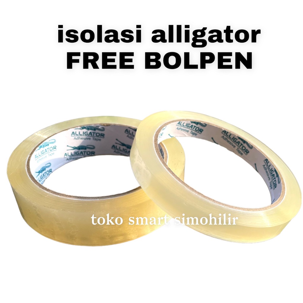 Isolasi Bening Transparan Merk ALLIGATOR merupakan perekat jenis tape dengan warna transparan untuk digunakan berbagai kebutuhan packing produk atau lainnya bahan kuat mudah merekat tidak gampang lepas dan tidak gampang robek ukuran 1. 12 mm x 100 yard 2. 24 mm x 100 yard setiap pembelian 1 pcs isolasi mendapatkan 1 pcs bolpen alligator