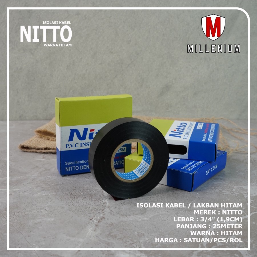 Isolasi Kabel / Lakban Hitam Merek : NITTO Lebar : 3/4" (1,9cm) Panjang : 25meter Warna : Hitam