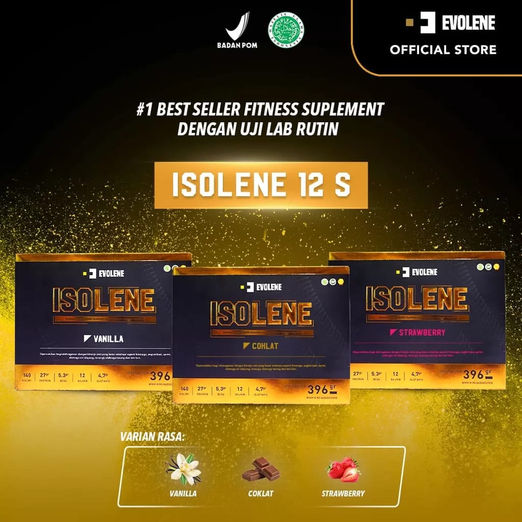 ISOLENE 1 BOX 12 SACHET WHEY ISOLATE BPOM HALAL SUSU PROTEIN FITNESS GYM EVOLENE ISOLEN ISOLIN COKLAT STRAWBERRY VANILA VANILLA BONUS SHAKER  EVOLEN EVOLINE EVOLIN