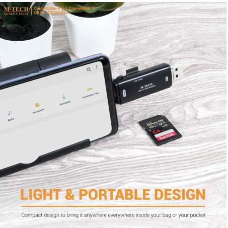 FITUR PRODUK: - Portable USB 2.0 Card Reader 3-in-1 - Mampu membaca kartu memori jenis MicroSD dan SD max.256GB - Menggunakan koneksi USB 2.0, Micro USB dan Type-C - Kompatibel dengan perangkat PC, Laptop, Smartphone dan Tablet