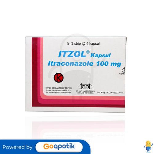 Deskripsi : PENGGUNAAN OBAT INI HARUS SESUAI PETUNJUK DOKTER. Itzol digunakan untuk mengobati infeksi yang disebabkan oleh jamur yang mana dapat menyerang berbagai bagian tubuh seperti paru-paru, mulut atau tenggorokan, kuku jari kaki atau kuku jari tangan. | Komposisi : Tiap kapsul mengandung itraconazole 100 mg | Dosis : ATURAN PAKAI HARUS SESUAI DENGAN PETUNJUK DOKTER. 1) Mengobati infeksi jamur pada mulut atau kerongkongan: 200 mg/hari dalam 1-2 dosis terbagi selama 1-2 minggu. Untuk infeksi yang resisten terhadap fluconazole: 100-200 mg 2x1 selama 2-4 minggu. 2) Pencegahan infeksi jamur pada pasien yang mengalami gangguan autoimun: 5 mg/kg/hari dalam 2 dosis terbagi. 3) Mengobati infeksi jamur pada saluran nafas: dalam bentuk kapsul: 100 mg/hari (200 mg/hari pada pasien yang menderita AIDS atau neutropenia) selama 15 hari.4) Mengobati infeksi jamur pada vagina: dalam bentuk kapsul: 200 mg 2x1 selama 1 hari 5) Mengobati panu: dalam bentuk kapsul: 200 mg/hari selama 7 hari.6) Mengatasi kudis dan kurap: dalam bentuk kapsul: 100 mg/hari selama 15 hari atau 200 mg/hari selama 7 hari. 7) mengatasi infeksi jamur kuku: dalam bentuk kapsul: 200 mg/hari selama 3 bulan. 8) Mengobati infeksi jamur sistemik: 100-200 mg sekali sehari, tingkatkan menjadi 200 mg 2x1. Untuk infeksi yang mengancam nyawa: dosis awal: 200 mg 3x1 selama 3 hari. 9) Pencegahan infeksi pada pasien yang menderita AIDS atau neutropenia: dalam bentuk kapsul: 200 mg/hari, tingkatkan menjadi 200 mg 2x1. 10) Mengobati tinea manuum (infeksi jamur pada tangan); tinea pedis (kutu air): dalam bentuk kapsul: 100 mg/hari selama 30 hari atau 200 mg 2x1 selama 7 hari. | Indikasi : Untuk mengobati infeksi yang disebabkan oleh jamur yang mana dapat menyerang berbagai bagian tubuh seperti paru-paru, mulut atau tenggorokan, kuku jari kaki atau kuku jari tangan. | Perhatian Khusus : Penderita gangguan fungsi hati, penderita AIDS, wanita menyusui. | Kemasan : DUS, 3 STRIP @ 4 KAPSUL | NIE : DKL9613307301A1