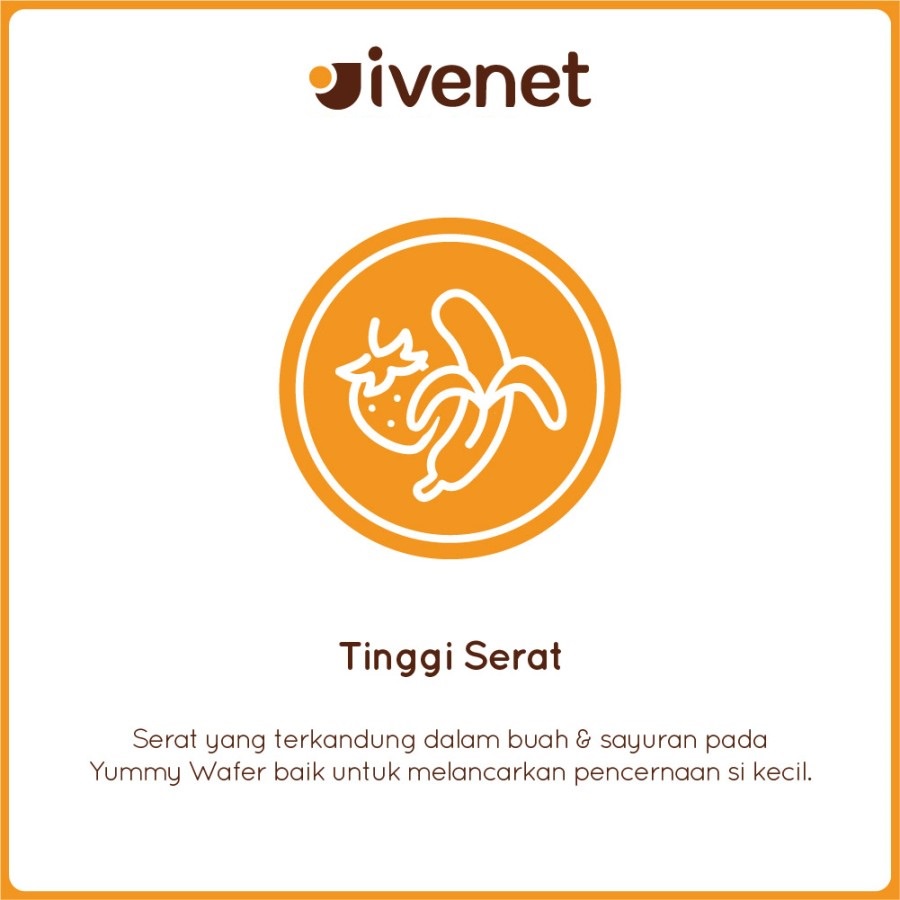 Keunggulan Ivenet Yummy Wafer: Kaya Vitamin E Terdiri dari campuran buah-buahan bergizi & kaya vitamin untuk si kecil.