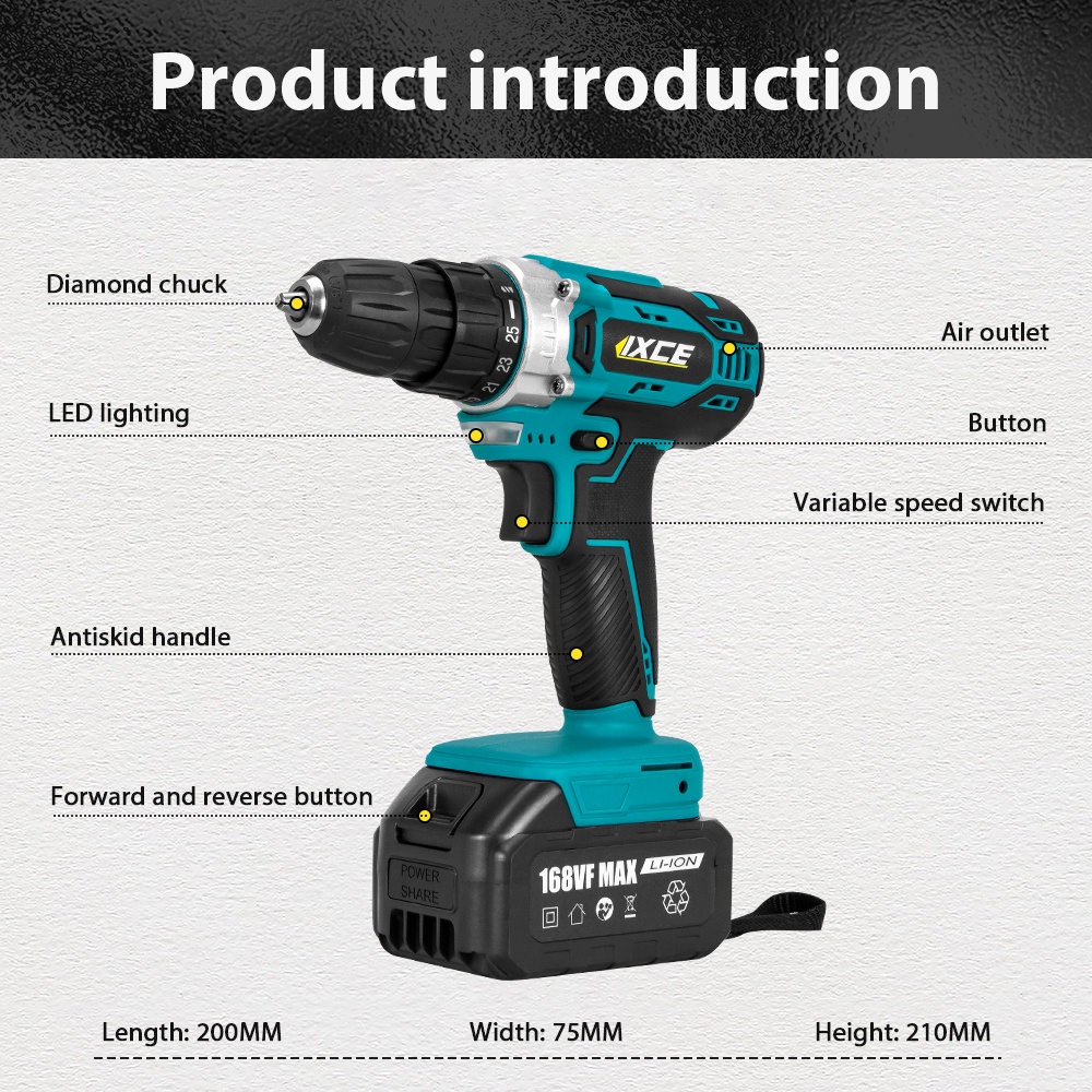 Perlengkapan Rumah > Perkakas > Bor, Obeng & Aksesoris > IXCE bor listrik 68VF / 88VF / 168VF Bor cordless Mesin bor Bor Tanpa Kabel 3-Tujuan hingga 2000 rpm 35NM Isi Ulang Harga grosir bisa nego