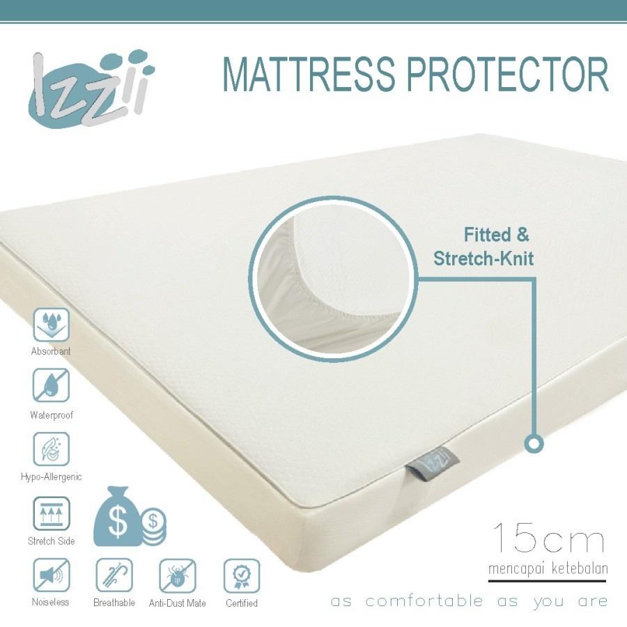 Baby Mattress Protector izzii dilengkapi dengan kain elastis pada sisi sampingnya, sehingga dapat digunakan untuk matras dengan ketebalan mencapai 15cm. Proteksi ganda untuk menahan cairan serta dapat melindungi anak anda dari tungau, bakteri, virus dan jamur yang berasal dari media atau matras anda.