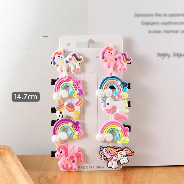 Berat = 30 gram Ukuran Jepitan = 2.8 cm Bahan = Alloy + Silicone Style = Cartoon & Fashion Gender = Baby, Kids, Girls Package = x1 Set Jepit Rambut (isi 10pcs)