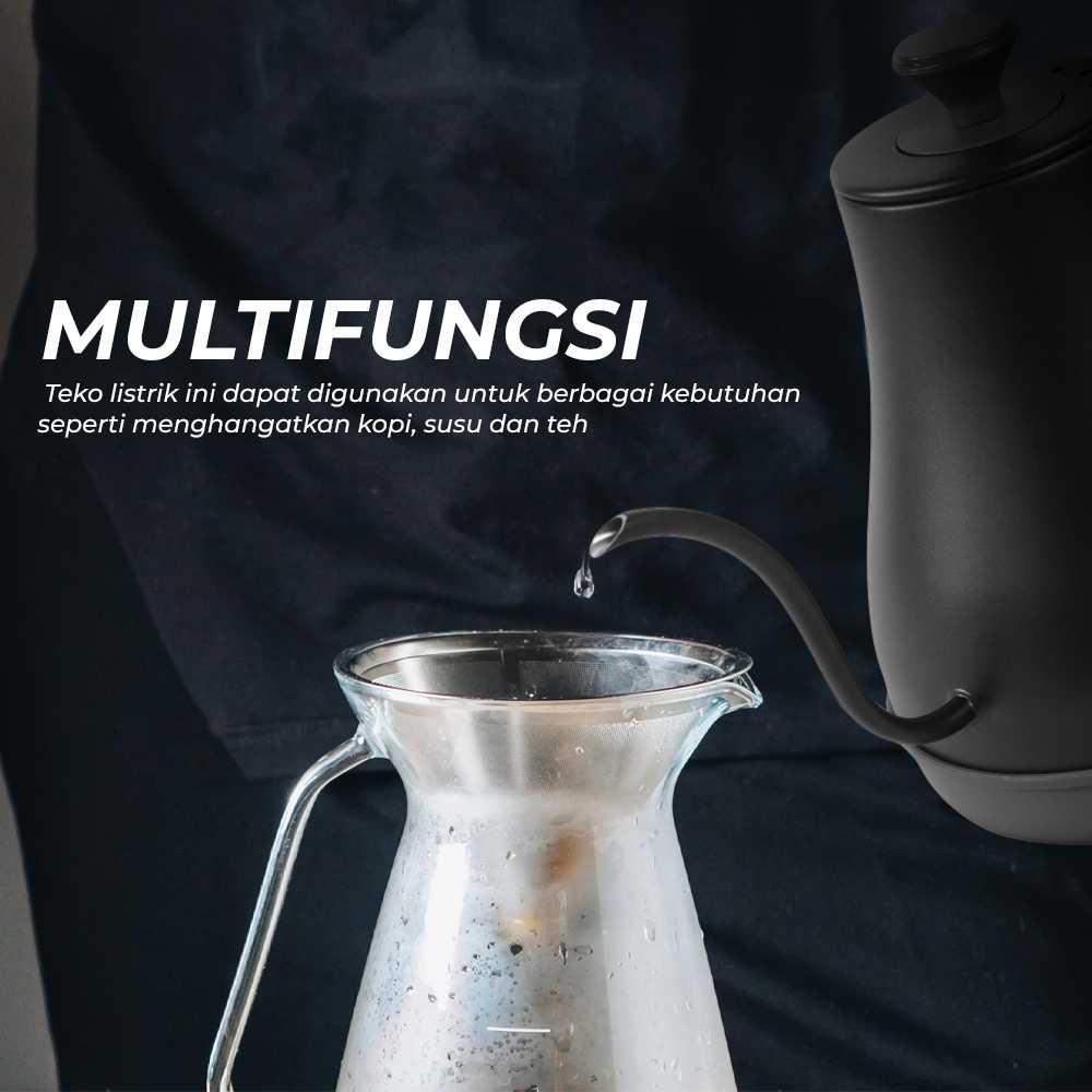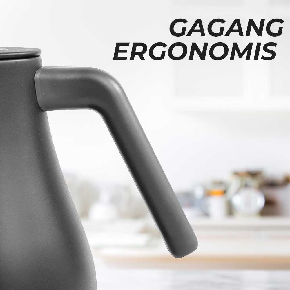 Fitur Gagang Ergonomis Teko ini memiliki gagang yang nyaman dan memudahkan Anda untuk menggenggam. Terdapat Gooseneck Spout yang memudahkan Anda untuk menuangkan air dari teko ini jauh lebih mudah.