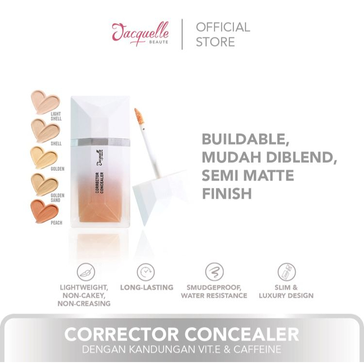 Jacquelle Corrector Concealer diformulasikan dengan Caffeine dan Vitamin E, efektif dalam meratakan dan mencerahkan komplesi kulit, serta dapat menutupi jerawat, kerutan dan noda di wajah. Memberikan hasil makeup yang lebih flawless dan sempurna. Best use with :