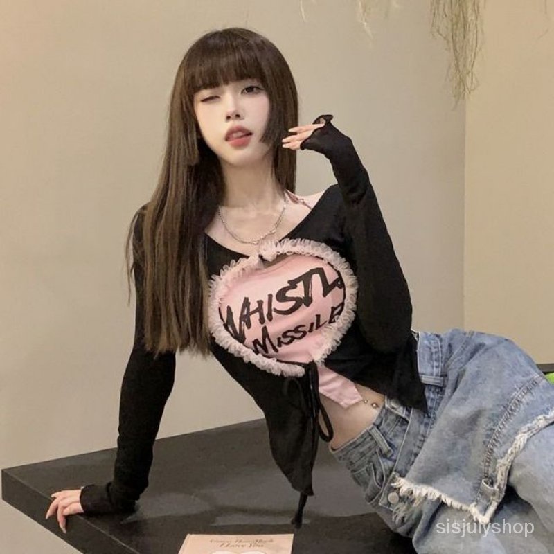 Detail Jahitan jala v-neck musim gugur atasan kaos lengan panjang baru wanita